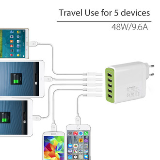 48W/ 9.6A high power, smart USB port to smart and fast charge 5 mobile devices simultaneously, good for travel use-White