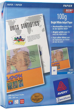 Avery Bright White Inkjet Papier A4 500 Sheets. Media weight: 100 g/m². Media sheets per package: 500 sheets