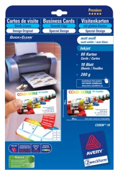 Avery C32030-10 . Width: 85 mm, Height: 54 mm. Media sheets per package: 8 sheets, Quantity per pack: 80 pc(s)