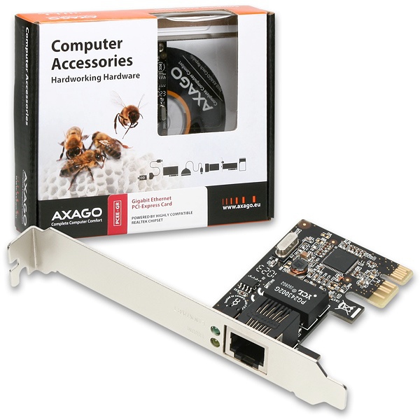 Axago PCEE-GR. Connectivity technology: Wired, Host interface: PCI-E, Interface: Ethernet. Supported data transfer rates: 10/100/1000. Chipset: Realtek RTL8111, Networking standards: IEEE 802.1p, IEEE 802.1Q, IEEE 802.3, IEEE 802.3ab, IEEE 802.3u. LED indicators: Power, Status. Compliance industry standards: IEEE 802.3, IEEE 802.3u, Cable type: UTP/STP, Compatible operating systems: - MS Windows 2000 - MS Windows XP 32/64bit - MS Windows Vista 32/64bit - MS Windows 7 32/64bit