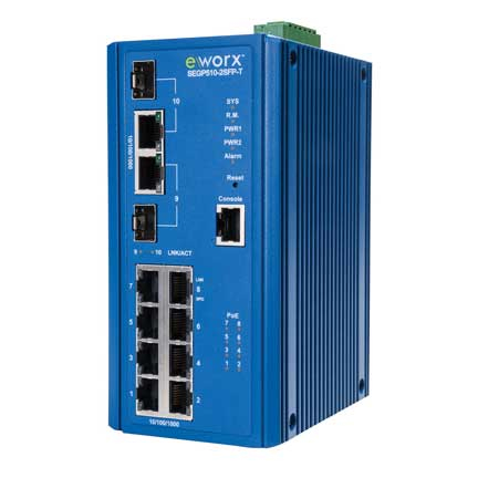 The SEGP500 series is a fully managed PoE+ Gigabit Ethernet switch with industrial, ruggedized features designed to work in harsh environment applications. This switch offers all the features expected in a managed switch such as VLAN, IGMP Snooping, Network Redundancy, Link Aggregation, SNMP V1,V2c,V3, Web and Telnet support. Smart PoE Management features allow advanced PoE settings and monitoring. Comprehensive network security features such as SSH, HTTPS/SSL, TLS, TTLS, PEAP and Radius are also offered. The SEGP500 series support Power over Ethernet, simplifying deployments with PTZ cameras, wireless access points (APs), and other standards-compliant powered devices. The products comply with the 802.3af/at PoE+ standards, supporting up to 30W on each PoE port, not to exceed the switches' specific power budget. Using the management interface, an administrator can control various PoE functions, such as remotely rebooting cameras or access points, from anywhere on the network, including over the Internet. The SEGP500 series features a powerful suite of diagnostic, monitoring, network performance capabilities and industry leading eWorx IXM™ cross management technology: Cable diagnostics, IPv4/IPv6 PING, fiber SFP monitoring (DDMI), port utilization, traffic statistics, QoS and rate limiting - all available from the Web GUI. The unique management feature, IXM™, allows the installer to auto synchronize firmware updates and push configuration settings to either individual or groups of switches.