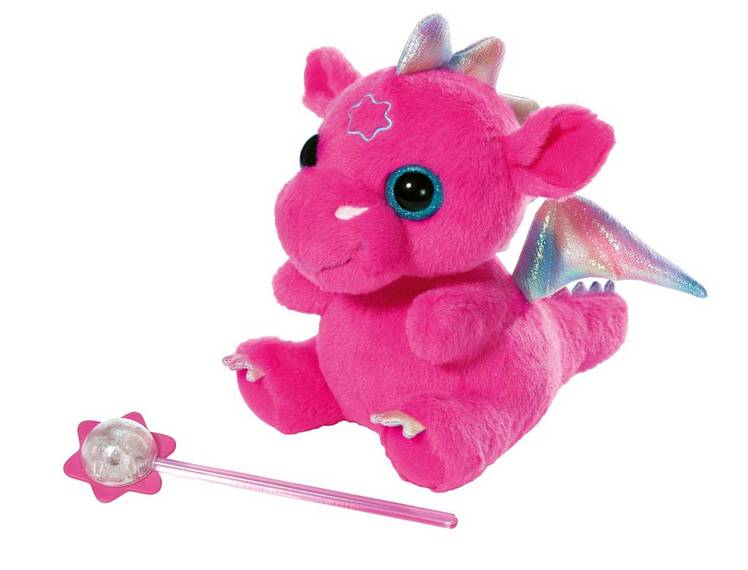 Cuddly soft fur, sparkling little wings, a shimmering tail, big eyes and a funny little voice – the perfect baby dragon. BABY born®'s little dragon in pink is a cute little guy with lots of charm. He makes funny noises when you tap his forehead with the magic wand. What might a baby dragon like this one want to tell us?