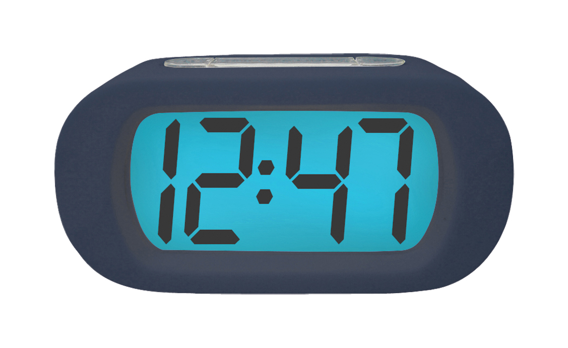 This LCD quartz alarm clock has cobalt-coloured rubber housing so it can take a beating. The alarm clock features blue backlighting and a snooze alarm.