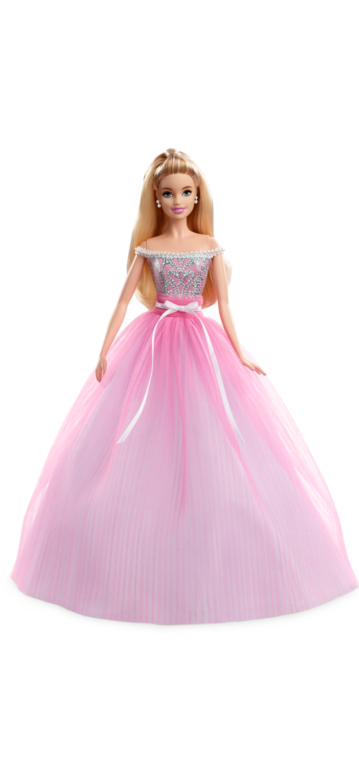 Your special day is here at last, and Birthday Wishes® Barbie® doll is excited to join your celebration. She's dressed in a party gown with a pretty “petals and pearls” print bodice trimmed with faux pearls, and a pleated pink tulle skirt over light blue taffeta. A dainty satin bow and drop “pearl” earrings are the sweetest finishing touches. Blow out your candles and make a wish for a wonderful year to come!