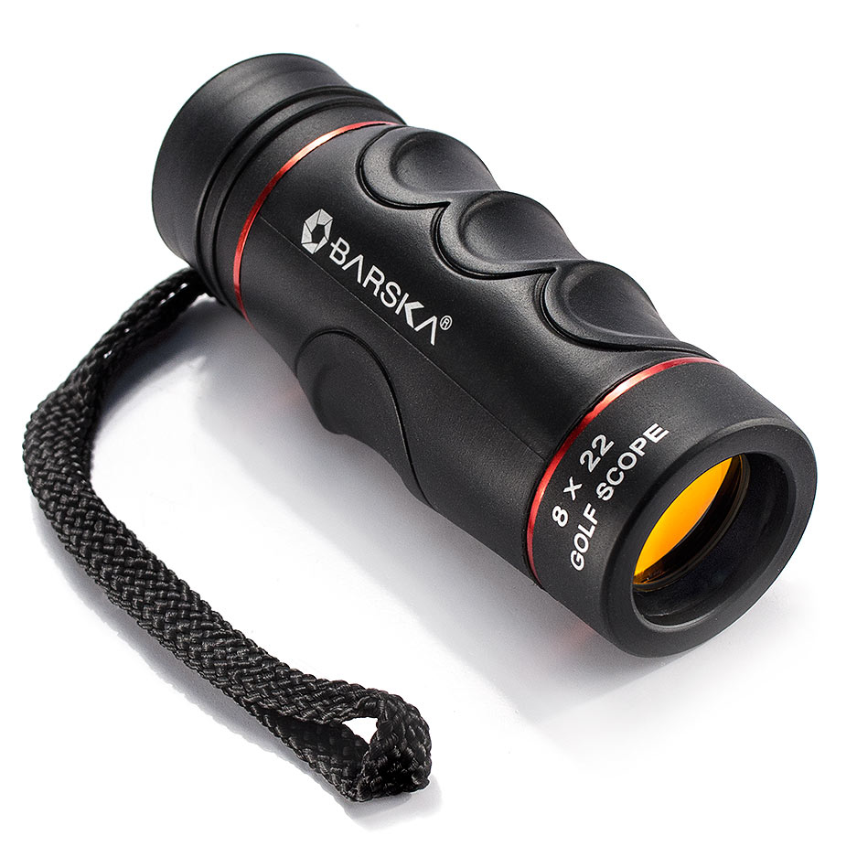 8x22 WP Golf Scope Estimate the range to the pin with internal distance reticle, Ruby coated optics, 100% Waterproof, Range: 50-200 yards, Leatherette pouch and wrist strap included