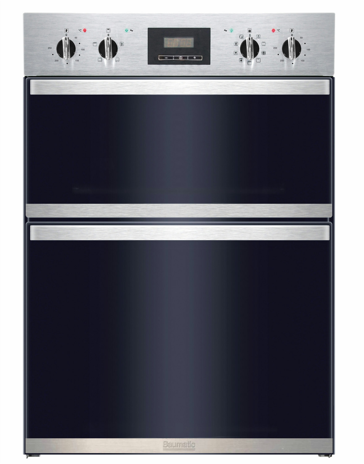 The Baumatic built-in double oven has a top oven and multifunctional main oven. It features a contemporary black glass and stainless steel finish and easy-clean enamel cavity. The LED full programmer allows you to set the cooking start time and cooking duration. Once finished, the oven will simply turn off.