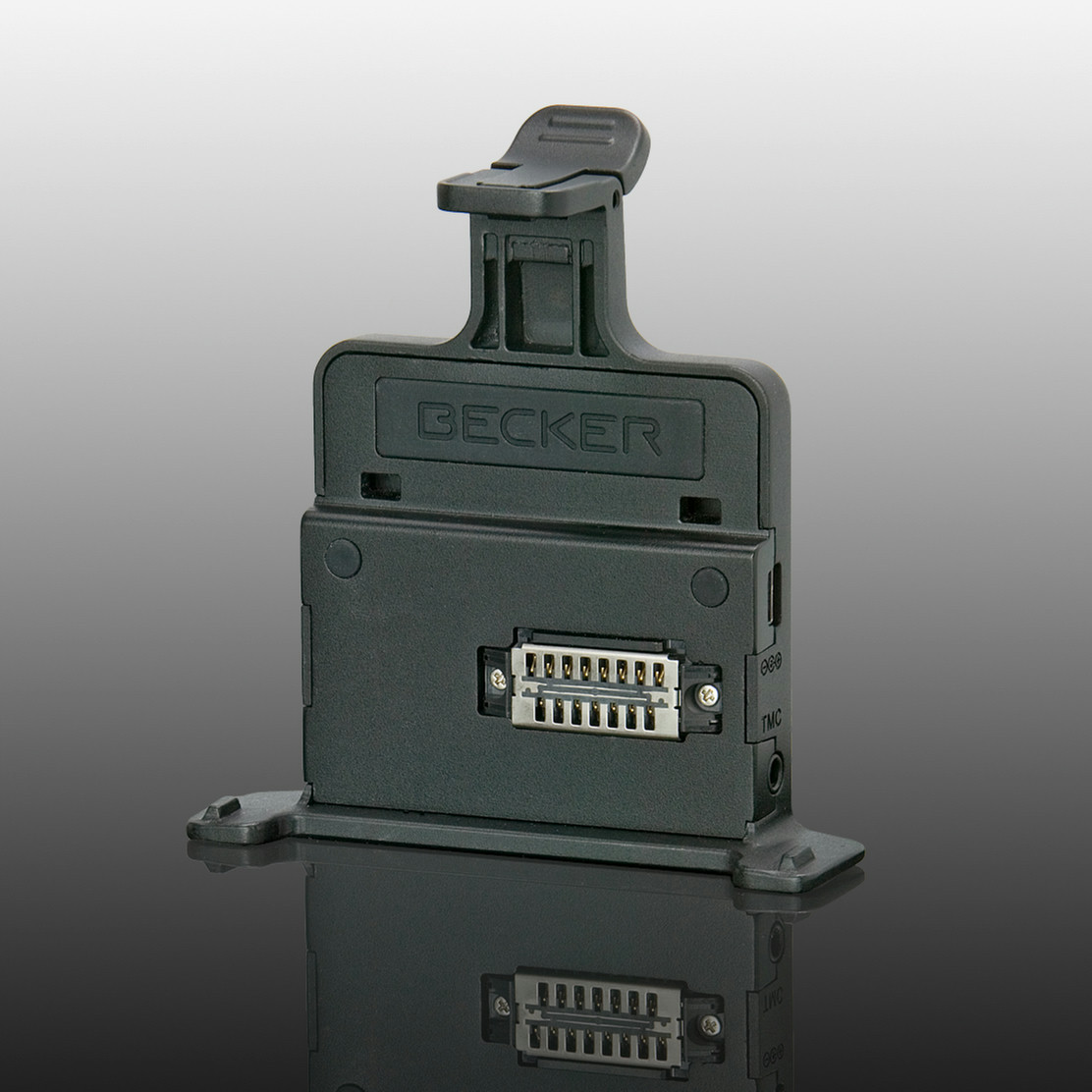 Docking station for enhanced integration in the vehicle. Compatible with Becker Traffic Assist 7928. Connections for power supply, TMC antenna, audio out (line out) and mute.