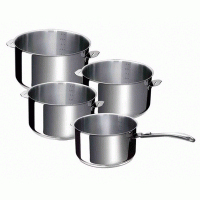 Set of 4 induction suitable saucepan bodies with removable long handle. The removable handle (included) has a safety indication for correct use.