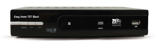 Best Buy Easy Home TDT Black. Signal source: Cable, Analog signal format system: NTSC, PAL, Digital signal format system: DVB-T. Video formats supported: MPEG2. AC input voltage: 230 V, AC input frequency: 50 Hz, Power consumption (typical): 5 W. Width: 200 mm, Depth: 110 mm, Height: 35 mm