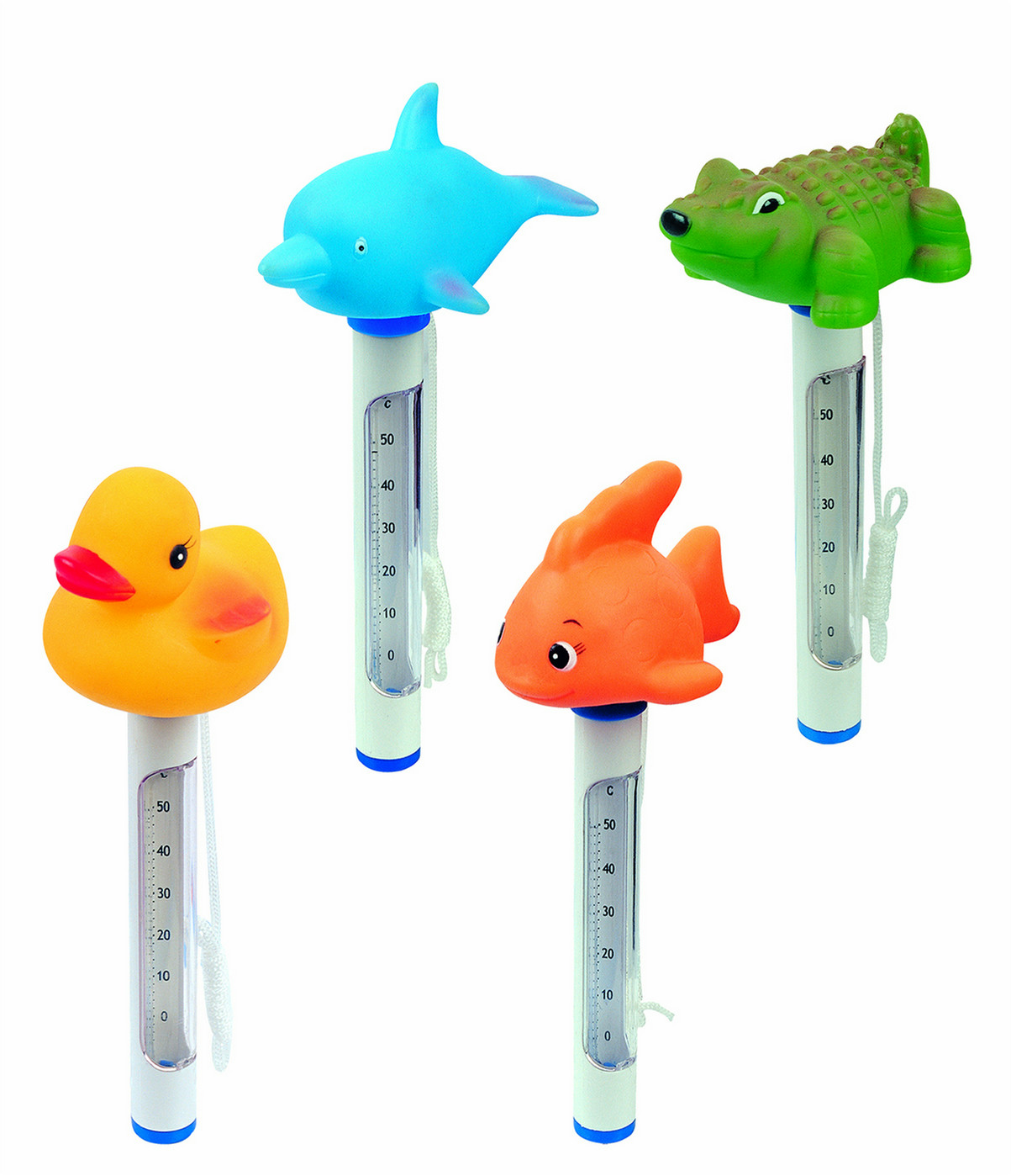 ASSORTED FLOAT POOL THERMOMETER - String attached to keep thermometer in place - Floating design - Easy to read temperature gradation - Displays in both Fahrenheit and Celsius - Content: One thermometer - Made in China