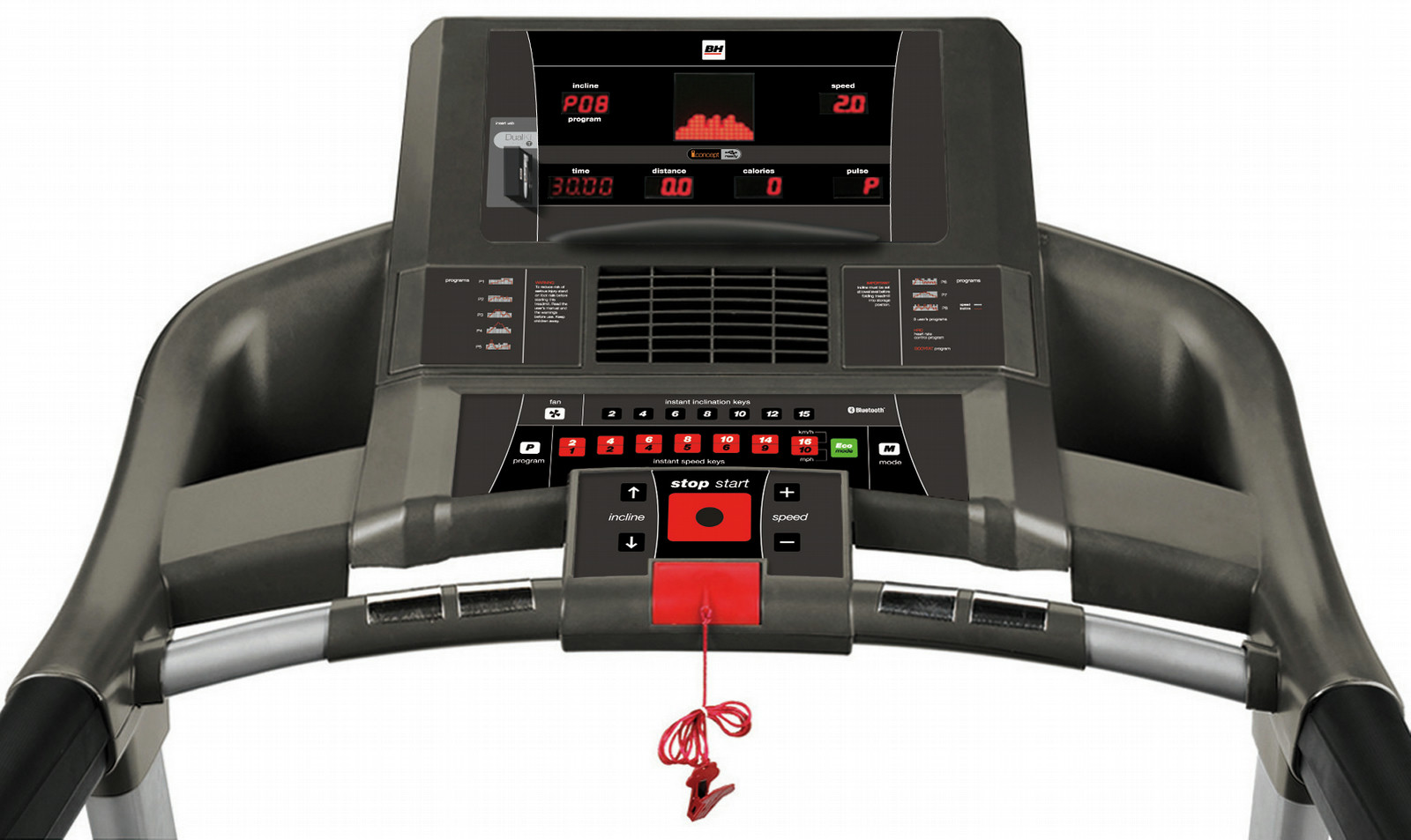 BH Home Fitness F5 DUAL. Maximum user weight: 140 kg, Maximum speed: 22 km/h, Standard heart rate measurement: Chest belt. Display: LED. Running area (W x L): 510 x 1410 mm, Width: 940 mm, Depth: 1490 mm