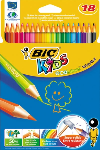 Wood-free resin colouring pencil made of 50% recycled material Available in 12 bright vibrant colours Chew resistant and will not splinter if broken Lead is ultra resistant to shocks