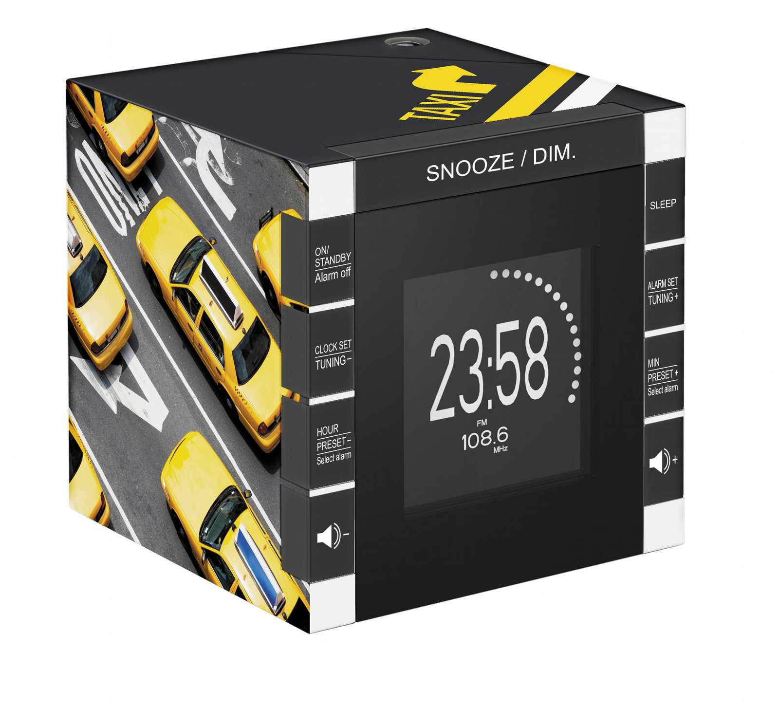 FM Tuner, 2 x AAA, 12 x 12 x 12 cm, with projector This alarm clock will bring you to New York and wake you up easily ! The double alarm, the snooze function and the calendar feature shows that this clock is more than design but also useful !
