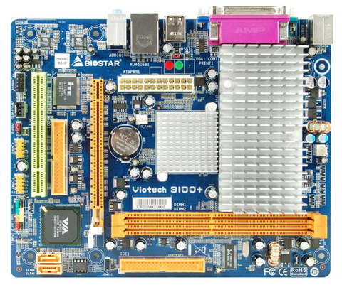 VioTech 3100+, VIA C7-D 1.6+ GHz, VIA CN896 / VIA VT8237S, 2 x DDR2 DIMM, 2 x SATA 3Gbps, 1 x IDE, VIA Chrome9 HC IGP, 5.1ch. HDA, 10/100 Mbit/s Lan, Micro ATX