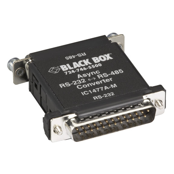 The Async RS-232 to RS-485 Interface Bidirectional Converter, DB25 Male to DB25 Female provides the same conversion of RS-232 signals. If the peripheral you’re connecting to operates on the RS-485 signal, you only need one IC1477A-M-US converter. But if the transmitting and receiving equipment only use RS-232, two converters are required, one at each end of the line.