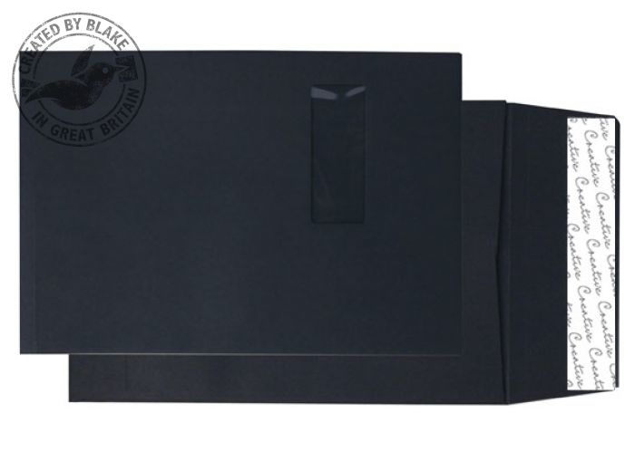 Jet Black, C4 340×230mm, Window 40 x 105mm, 213up, 24lhs, Gummed, Pack 125, 140 GSM, Pocket, Matching Paper Available, FSC Certified Product