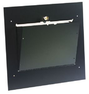 or open position. The cabinet is finished in black and is made from sturdy 16-gauge steel. It is supplied with a backbox which includes an easily mounted AC power receptacle.