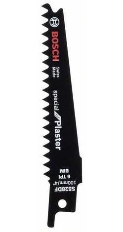 Bosch S 528 DF. Product type: Sabre saw blade, Suitable for materials: Plasterboard, Blade material: Bimetal. Blade tooth spacing: 4.3 mm, Cutting thickness (max): 5 cm. Overall length: 10 cm. Quantity per pack: 1 pc(s), Package type: Blister