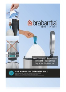 Dispenser pack of slimline Size F bin liners - White Brabantia's tailored-to-fit waste bin liners, are available in a large dispenser pack that works like a tissue-box. It is a flat bag with a large opening. Just grab a new liner and pull it out easily; they are not attached to each other, like most rolled-up waste bags.