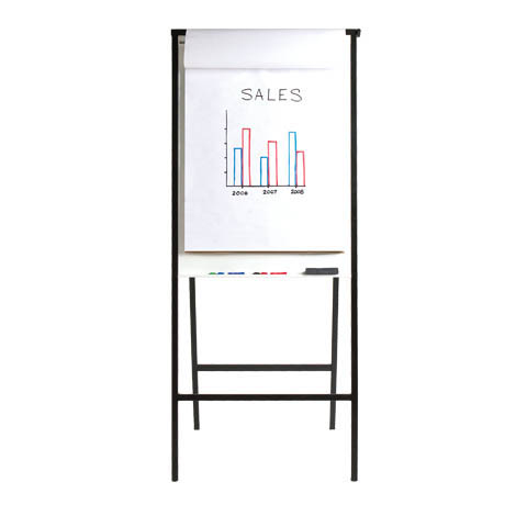 Folding Dry Erase/Flip Chart Easel lets you use the dry erase surface or use the easel with a standard two-hole pad, pad (not included). A 1-3/4" deep trough holds markers and eraser. Includes a WMK1-GM marker kit. Easel folds flat. Black powder paint finish on a steel frame.