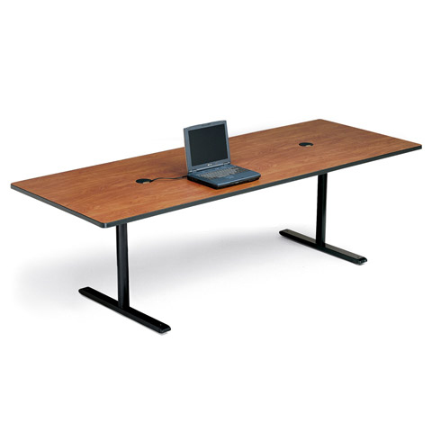 Tables are finished in laminate with 3mm T-Mold edge banding. A built-in stiffener keeps the tabletop from bowing. Tabletop grommet holes and oval cutouts on each leg allow cord access to the floor. Two leveling glides located inside each foot channel are adjustable from the top to level the table on uneven floors. Includes two grommet holes which can be equipped with an optional Power Dome unit.
