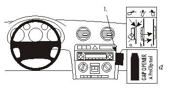 1. Press the thin ends of the enclosed gap openers into the gap between the control panel and the dashboard, to widen the gap. Place the gap openers about 10 cm apart. Peel off the cover of the adhesive tape on Part 1. Press the angled edge on Part 1 into the gap between the gap openers.