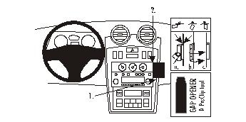 1. Press the thin end of the enclosed gap opener into the gap between the dashboard and the surrounding frame to widen the gap. Peel off the cover of the adhesive tape on Part 1. Press Part 1 into the gap above the gap opener. Press Part 1 away from the steering wheel, so the adhesive tape attaches and the angled edge hooks behind/under the control panel. Pull out the gap opener.