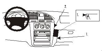 3. Hook the left part of the ProClip, with adhesive tape, into the gap at pos. 2 between the control panel and the dashboard. Press forward on the upper part of the ProClip, then on the middle and the lower part of the ProClip until you hear or see /feel it snaps into place.