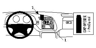 1. Press the thin end of the enclosed gap opener into the gap at pos. 2 to widen the gap between the padded dashboard and the frame surrounding the control panel. Peel off both adhesive tape covers on the ProClip.