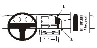 1. Press the thin end of the enclosed gap opener into the gap at pos. 1. Hook the upper part of the ProClip, with groove, into the gap next to the gap opener at pos. 1. Pull out the gap opener.