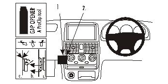 1. Press the thin end of the enclosed gap opener into the gap between the dashboard and the frame surrounding the control panel. Peel off the cover of the adhesive tape on Part 1. Press the angled edge of Part 1 into the gap below the gap opener. Press on Part 1, away from the steering wheel, so the angled edge hooks behind the control panel and the adhesive tape attaches. Pull out the gap opener.