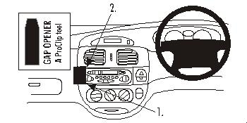 2 and 3. Press the thin end of the enclosed gap opener into the gap between the dashboard and the frame surrounding the stereo. Press forward on the gap opener so the gap widens. Press forward firmly on the upper part of the ProClip so it goes into the gap between the control panel and the frame furrounding the stereo. Press hard on the ProClip until you hear/feel it snaps into place two (2) times. Press alternately on the right/left side of the upper part of the ProClip. Pull out the gap opener.