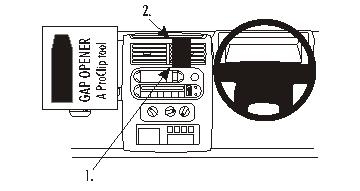 3. Press the thin end of the enclosed gap opener into the gap between the dashboard and the "coin box", to widen it, and at the same time: press forward on the upper part of the ProClip so the angled edge snaps into the gap next to the gap opener. Pull out the gap opener and press down on top of the ProClip for best possible attachment.