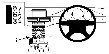 1. Press the thin end of the enclosed gap opener into the gap between the center console trim and the center console sidewall, to widen the gap. Peel off the adhesive tape cover on the ProClip.