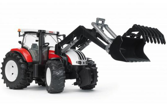 The Steyr CVT 6230 complements the popular BRUDER Profi series. Its fully glazed polycarbonate cab and doors that can be opened increase the quality as well as the fun factor of this vehicle. A drawbar coupling including height-adjustable lifting unit allows this vehicle to be combined with all attached and trailed implements of the Profi series. The additional twin tyres that can be attached to the vehicle increase the off-road capabilities of the tractor, which comes standard with profiled tyres. The same holds true for the off-road front axle which can be steered by means of an additional steering rod. A detachable front weight with hoisting mechanism provides for optimum load distribution. The fully functional front loader also adds to the fun factor of this vehicle.