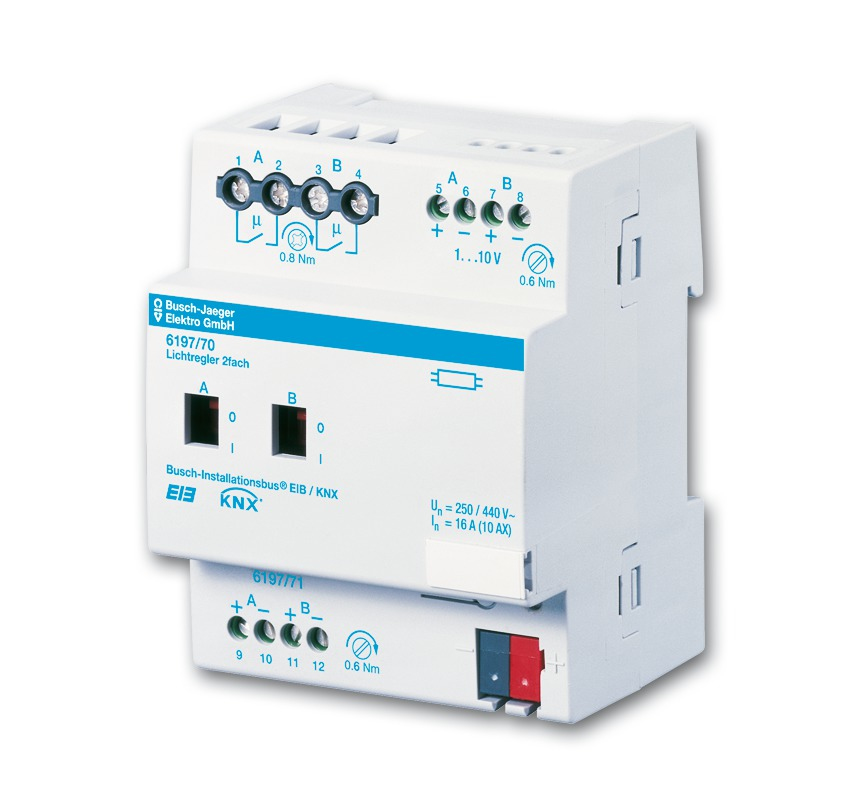 Busch-Jaeger 6151-0-0208. Product type: Switching/dimming actuator, Mounting type: DIN rail-mounted, Maximum outdoor range: 100 m. Power source type: AC, Input voltage: 230 / 440, Input frequency: 50 - 60. Width: 72 mm, Depth: 64 mm, Height: 90 mm