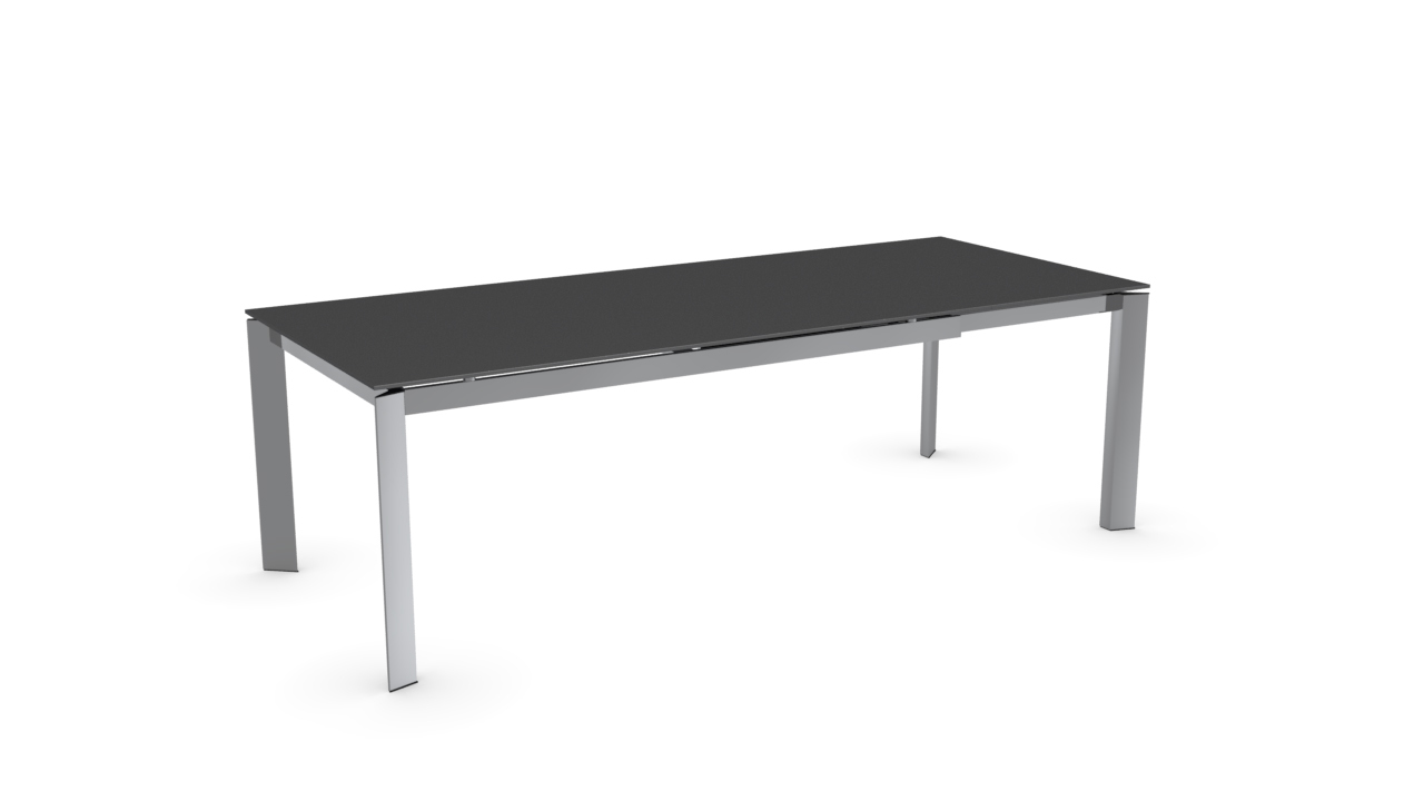 The BARON table contains a handy mechanism able to increase the top surface. Pull the frame towards you so that the two legs with hidden castors slide on one side allowing the leaf to be pulled out. With a simple rotation the leaf fitted on metal tracks comes out of its housing and lines up with the top. The triangular or rectangular legs stay at the perimeter, ensuring maximum comfort for all guests.