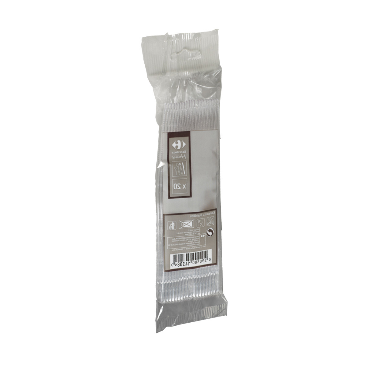 Carrefour Home 2420. Tableware set per person: Disposable knife, Material: Plastic, Colour of product: Transparent. Package width: 7 cm, Package depth: 3 cm, Package height: 20 cm. Number of products included: 1 pc(s)