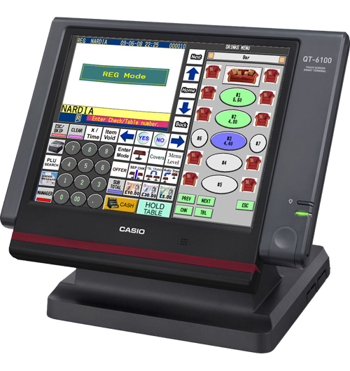 A cash register with a FLAIR! The QT-6100's rich software & hardware offering give you the flavor of a more expensive PC based system but the stability of solid state. The vibrant 12.1" flat panel, color LCD operator display jump out at you along with the high resolution graphic icons assigned to keys. Additional features include multiple COM ports for peripheral connectivity, a 10/100 Base-T Ethernet network, Compact Flash card port for program and sales backup. All of this and much more on a cash register platform!