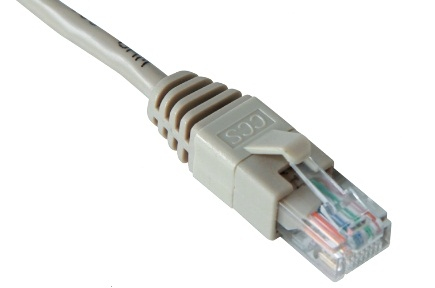CAT 5E CCS RJ45-RJ45 unshielded patch cord, with gray cable and interchangeable colored clips.