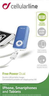 Have you ever had to use a battery charger that recharges your device too slowly?Today speed and power are the main features of the new Free Power Dual. Fast Charge function is able to recharge at maximum possible speed for even more powerful devices.Despite its 4400 mAh, battery recharges quickly, in about 2 hours, with Fast Recharge and 2 incoming ports of charge!You can recharge it with your device, thanks to the Simultaneous chargers, which allows for full charge and ready use at all times!