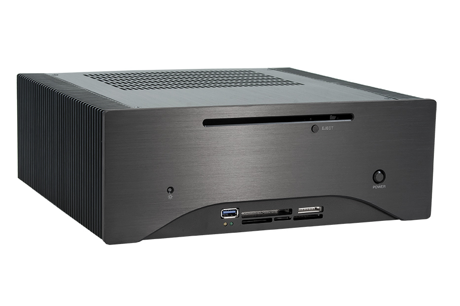 HF-200SL – HTPC? Media center? 100% Silent PC? Your aim is, building a system with a sound level of 0 db? Then this unique case is the perfect solution. Noisy case fans become unnecessary, as this exquisite case comes with the latest heat pipe technology which allow the thermally heated components to emit the heat to the massive but yet, descent cooling fins on both sides of the chassis. Owing to the high adjustability of the heat pipe, you can install all common INTEL mini ITX mainboards irrespective of the CPU position. Further, a card reader is pre-installed to the front panel and the possibility to install a slim line ODD is of course, given. Left to mention that the (85W, 90W or 120W, pending on the individual demand) PSU is externally solved so that there is no source of sound emission what-so-ever.