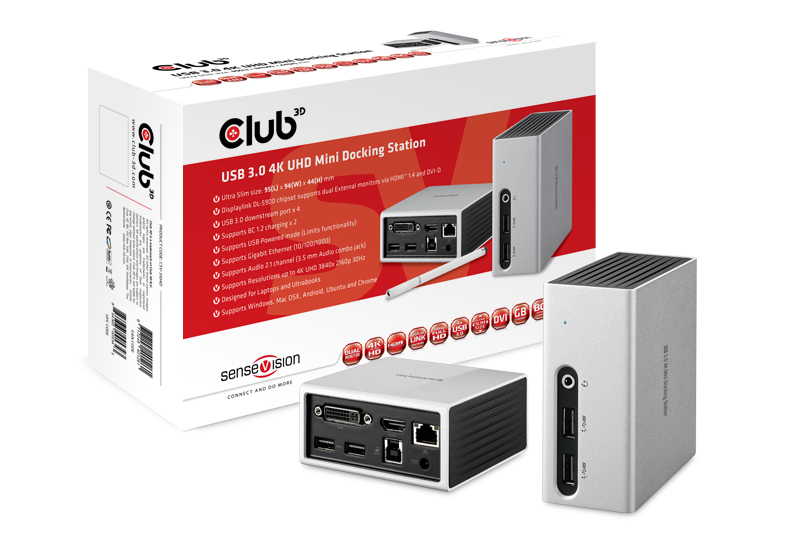 Because of its convenient and compact design, the Club 3D USB 3.0 4K UHD Mini Docking Station is a versatile tool that provides you maximum functionality from your Small desktop replacement or mobile companion.