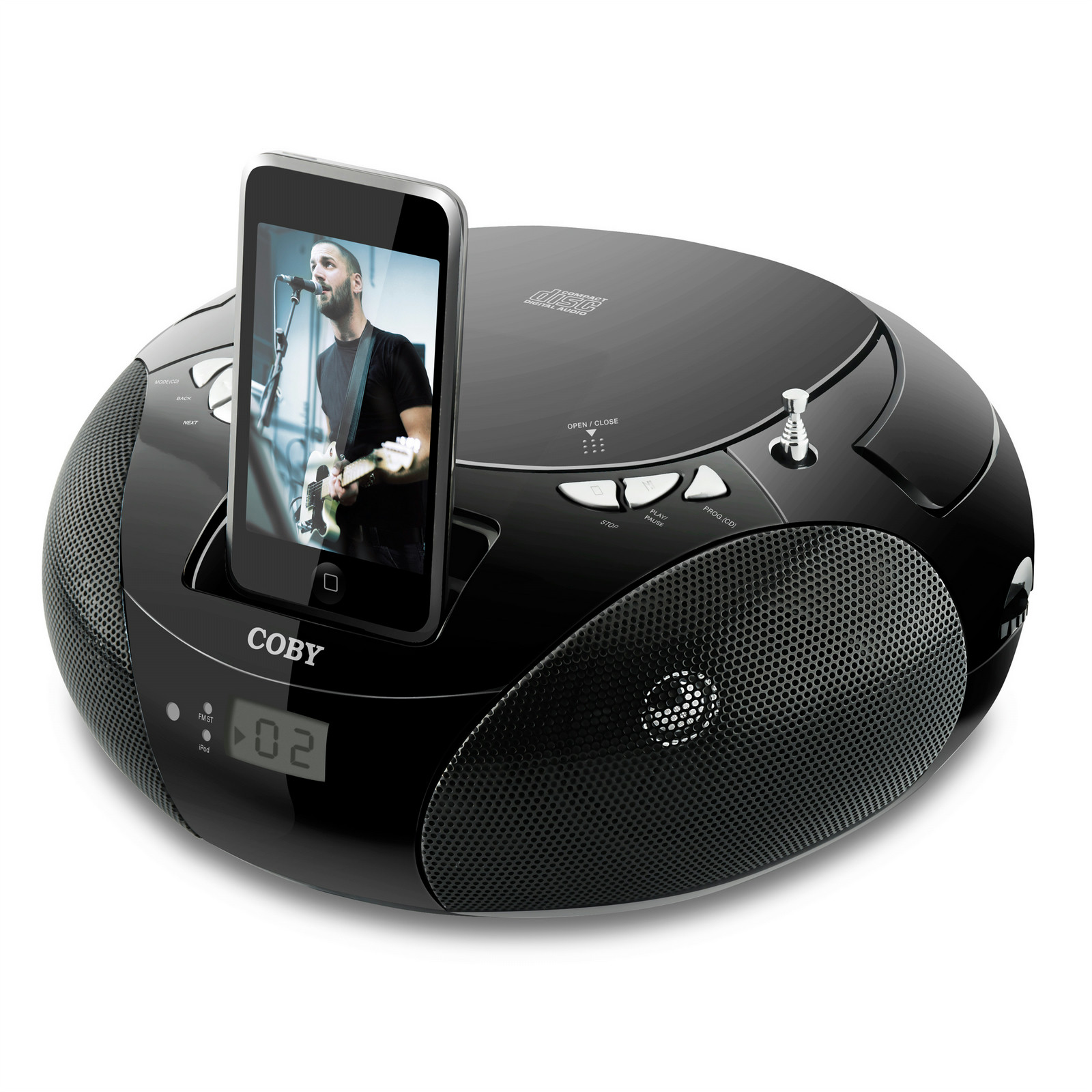 Share your digital music on the go, with Coby's portable CD boombox for iPod®. Snap any iPod® into the CSMP142's universal dock for high-quality playback of your music library, or slip a disc into the built-in, top-loading CD player. Programmable CD track memory, integrated full-range speakers and AM/FM radio also included.