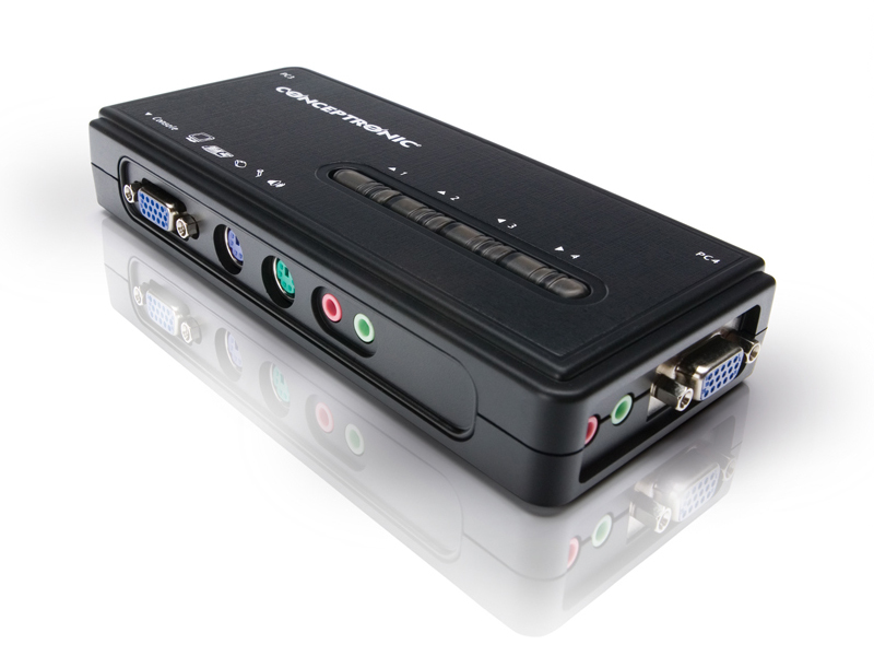 monitor, keyboard and mouse on 4 different computers. It is even possible to share one microphone and/or and speaker set. The KVM switch comes complete with all cables. Switching to the other computer can be done in 2 different ways, a hotkey combination on your keyboard or buttons on the KVM switch.