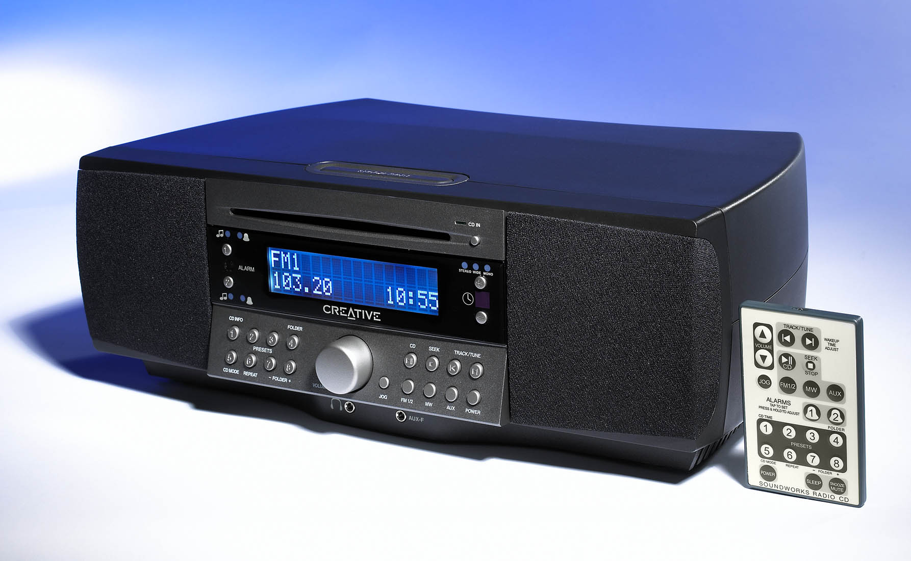 The SoundWorks® Radio CD from Creative® is a hi-fi breakthrough in tabletop audio for the home. Built with the expertise of the designers at Cambridge SoundWorks, the specialist audio division of Creative Labs, this innovative system delivers sound that fills a room so effectively that listeners often look around for separate external speakers! Yet two stereo satellites and a powerful subwoofer are all contained within the elegant hi-fi design, giving incredible results with stereo FM broadcasts as well as MW radio, standard CDs and even MP3 on CDR/CDRW. This exciting system sets a new standard for acoustic realism and extensive user features, which are accessible via the comprehensive wireless remote.