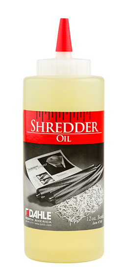 Dahle Shredder Oil The key to maintaining your shredder at optimal performance is proper oiling. Dahle shredder oil is the only lubricant you should use in your paper shredder. It is specially formulated so it won't leave any residue that could attract dust and clog the shredding mechanism. The procedure for lubricating your shredder is simple. Apply a fine stream of oil from one side of the feed opening to the other. Then run the shredder in reverse for a few seconds to help distribute the lubricant evenly.
