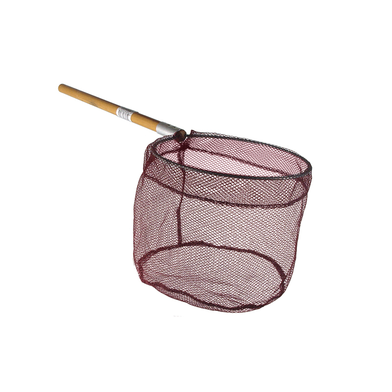 This wooden handle bait and crab scoop net features a circular hoop with a full sized, flat-bottomed basket of nylon netting