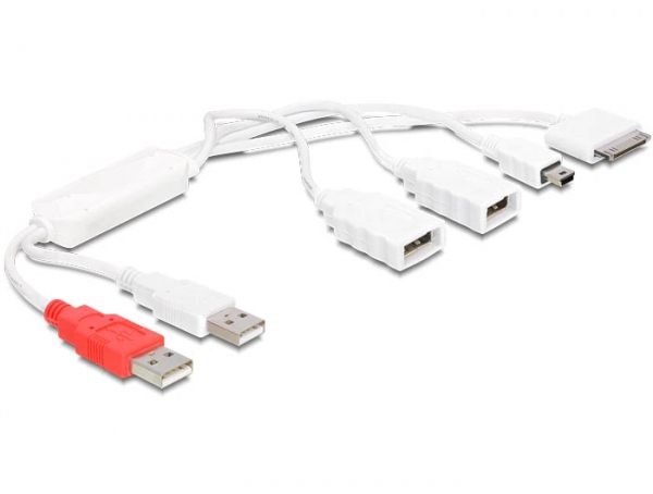 This flexible Cable Hub enables the operation of different devices via two free USB ports on your PC or notebook. You can transfer data as well as charge your devices. The 2 USB-A connector are suitable for common USB devices. The USB mini 5pin connector enables the connection of mobile phones, cameras, external enclosure etc. The iPhone port is made for Apple products.
