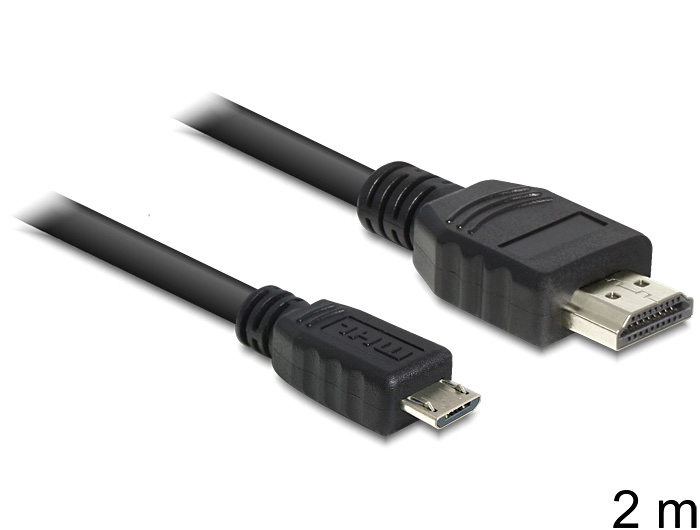 Cable MHL male > High Speed HDMI male 2 m This cable by Delock with MHL interface, a combination of USB and HDMI, complies with the connection of different smartphones and tablet-PCs. You may connect your smartphone to a TV with HD support and watch pictures or videos in HD quality, in case the HDMI port on your output device supprts the MHL function. This connection does not require any additional HDMI cable, since this cable already provides a HDMI male connector. Compared to previous MHL adapter and cables, you don’t require an additional power supply.